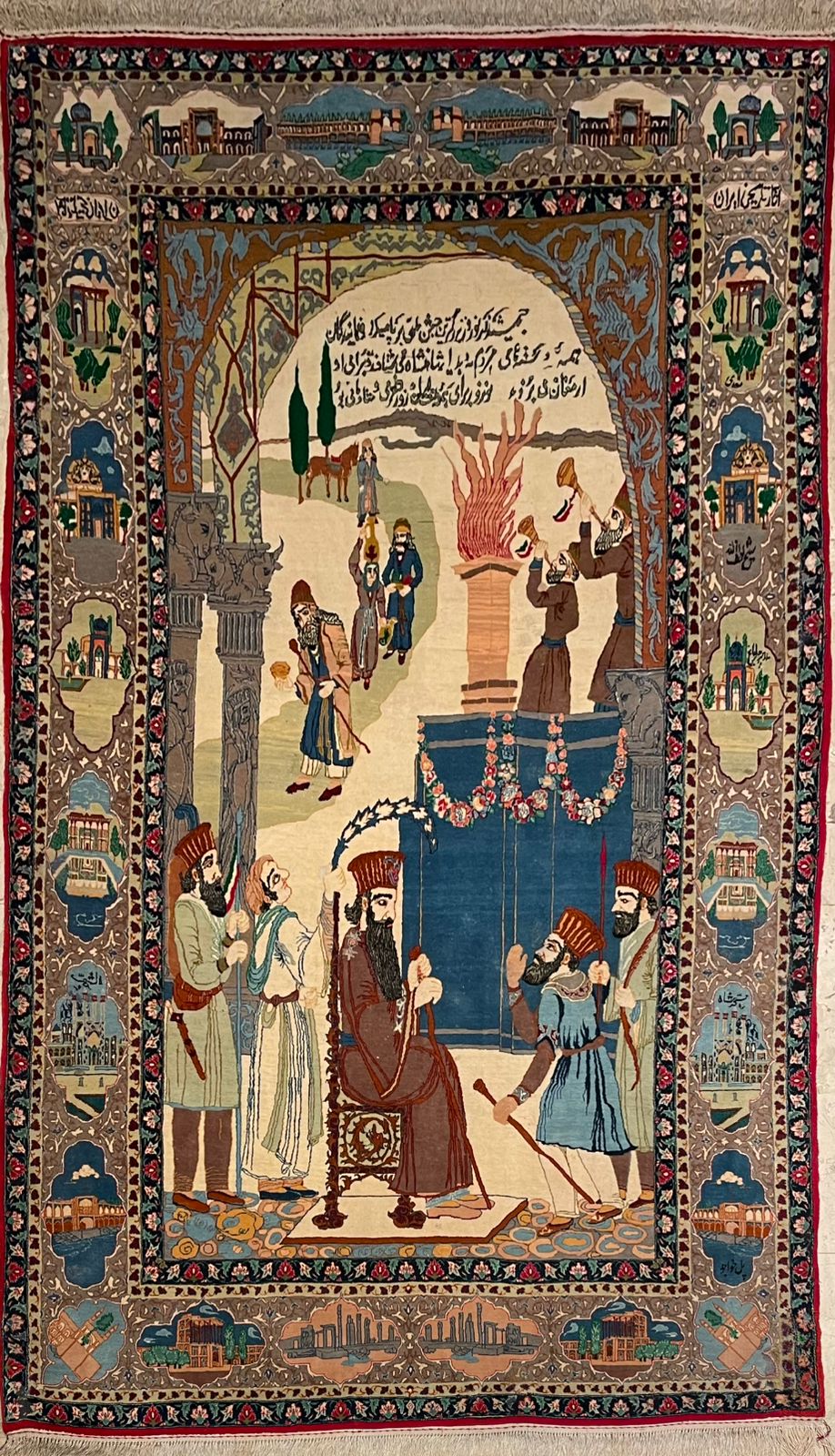 This Persian pictorial rug shows a royal scene inspired by ancient Persia, like the palaces of Persepolis. The king sits on his throne, surrounded by his court, dealing with an important problem — a betrayal, accusation, or serious dispute. The central Persian text announces the news, which makes the king angry. Instead of a normal decision, he turns to a sacred ritual: fire. In Zoroastrian tradition, fire represents truth and purity, showing who is honest and who is guilty. A ceremonial fire is lit by priests, and the accused or witnesses are presented before the king and the fire. The rug uses this scene symbolically — the fire reveals truth. The tall columns decorated with animals, which look like rhinoceroses, reflect the style of Persepolis and show power and strength. Smaller texts in the borders mention cities or palaces, adding to the cultural and imperial feel. Overall, the rug tells a symbolic story of royal justice, truth, and Persian heritage. It is a fine example of a “story carpet,” combining art, culture, and history.