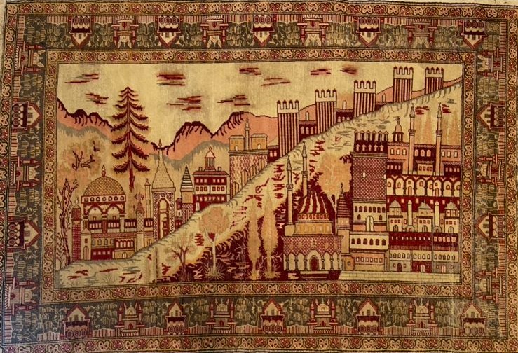 Woven in the tradition of Hereke, this Turkish tableau rug reflects the artistic legacy of the Ottoman Empire, where carpets were created not only for decoration, but to tell visual stories. Crafted entirely in wool, it carries a softer, more grounded character while preserving the intricate detail of an imagined imperial city. Domed mosques, rising minarets, and fortified walls stretch across a stylized landscape inspired by the grandeur of Istanbul and the elegance of miniature painting traditions. The balanced composition and symbolic elements; like cypress trees representing eternity, bring a sense of history and narrative into the piece, making it both a decorative work and a window into a refined artistic heritage.